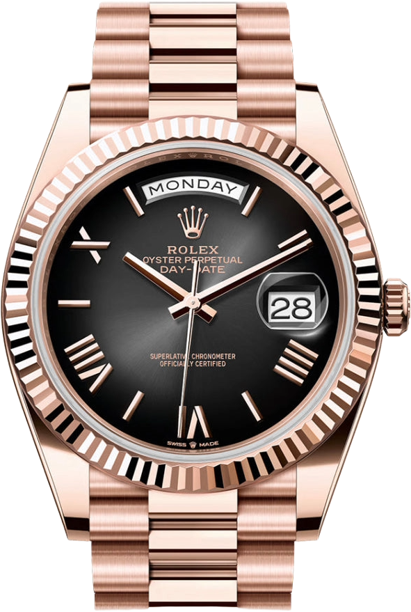 This reference stands out for its slate ombré dial, which fades from a lighter grey center to a darker edge. The gradient finish adds depth and gives the classic Day-Date design a more modern look. To preserve the beauty of its pink gold watches, Rolex created and patented an exclusive 18 kt pink gold alloy cast in its own foundry: Everose gold. Introduced in 2005, 18 kt Everose is used on all Rolex Oyster models in pink gold.