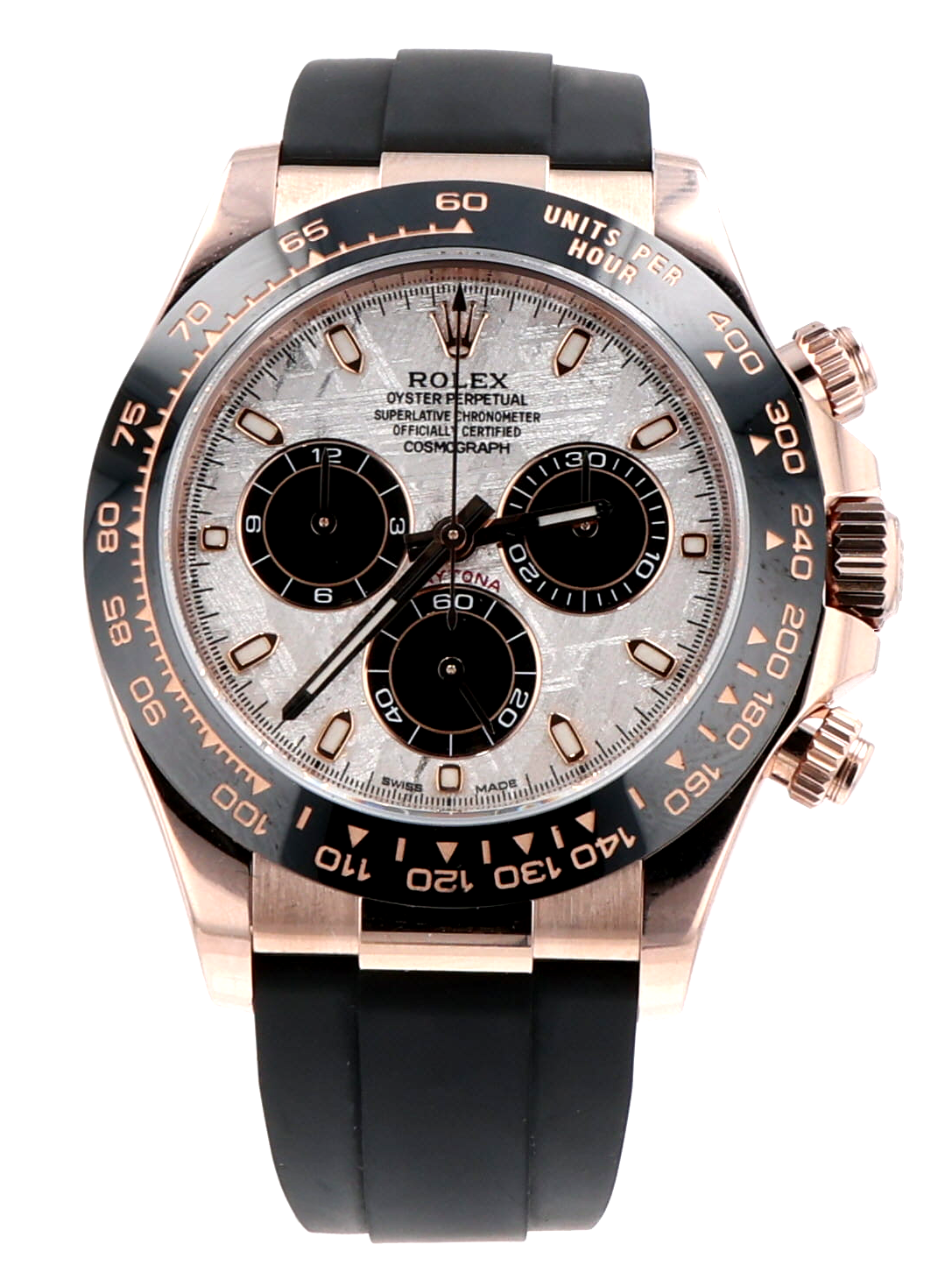 This watch is actually out of this world. The dial of this Everose gold Daytona is cut from the Gibeon meteorite, which fell in prehistoric Namibia. Acid treatment reveals the Widmanstätten pattern, crystalline structures formed as the asteroid cooled in space.